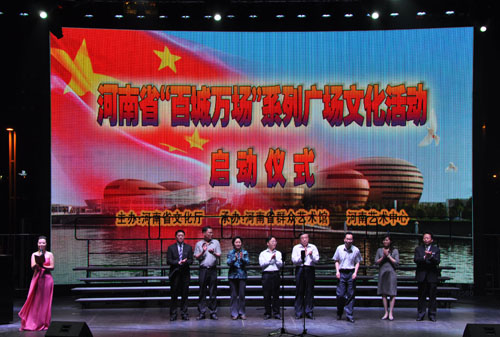5月4日,由河南省文化厅主办,各省辖市文广新(文化)局和河南省群众艺术馆、河南艺术中心承办的全省“百城万场”系列广场文化活动在郑东新区艺术中心广场正式启动。省委宣传部副部长李庚香、省文化厅副厅长崔为工、省文化厅纪检组长陈月玲等领导参加了启动仪式。