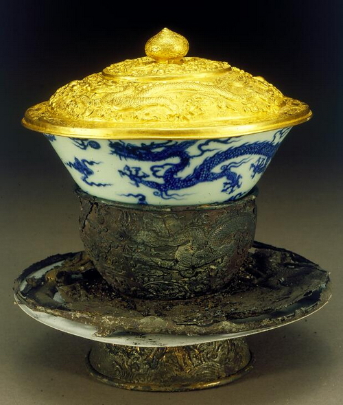 金锺、青花龙纹瓷锺、银鎏金托