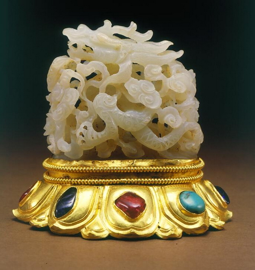 金镶宝石白玉镂空龙穿牡丹纹帽顶