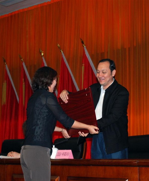 新疆维吾尔自治区厅党组成员、副厅长艾尼瓦尔·阿不都许库尔为农民工文化建设方面受到文化部表彰的克拉玛依市雅典娜社区授牌