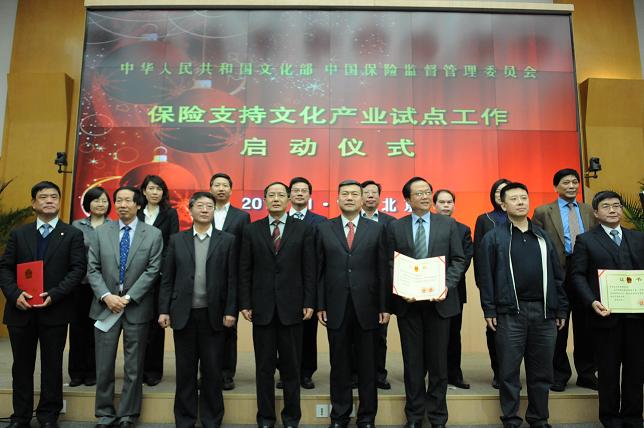 2011年1月10日,文化部与保监会在京联合举行“保险支持文化产业试点工作启动仪式”,同时公布了第一批11个文化产业保险试点险种和3家试点保险公司。