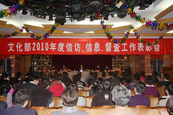 文化部办公厅主任杨建昆主持表彰会。23个信访工作优秀承办集体、58名优秀承办个人,39个文化信息工作先进单位、69名先进个人,5个办理中央领导同志批示及部党组会、部务会、部长办公会和通气会议定事项工作优秀单位、13个优秀组织单位和60名优秀承办人员受表彰。