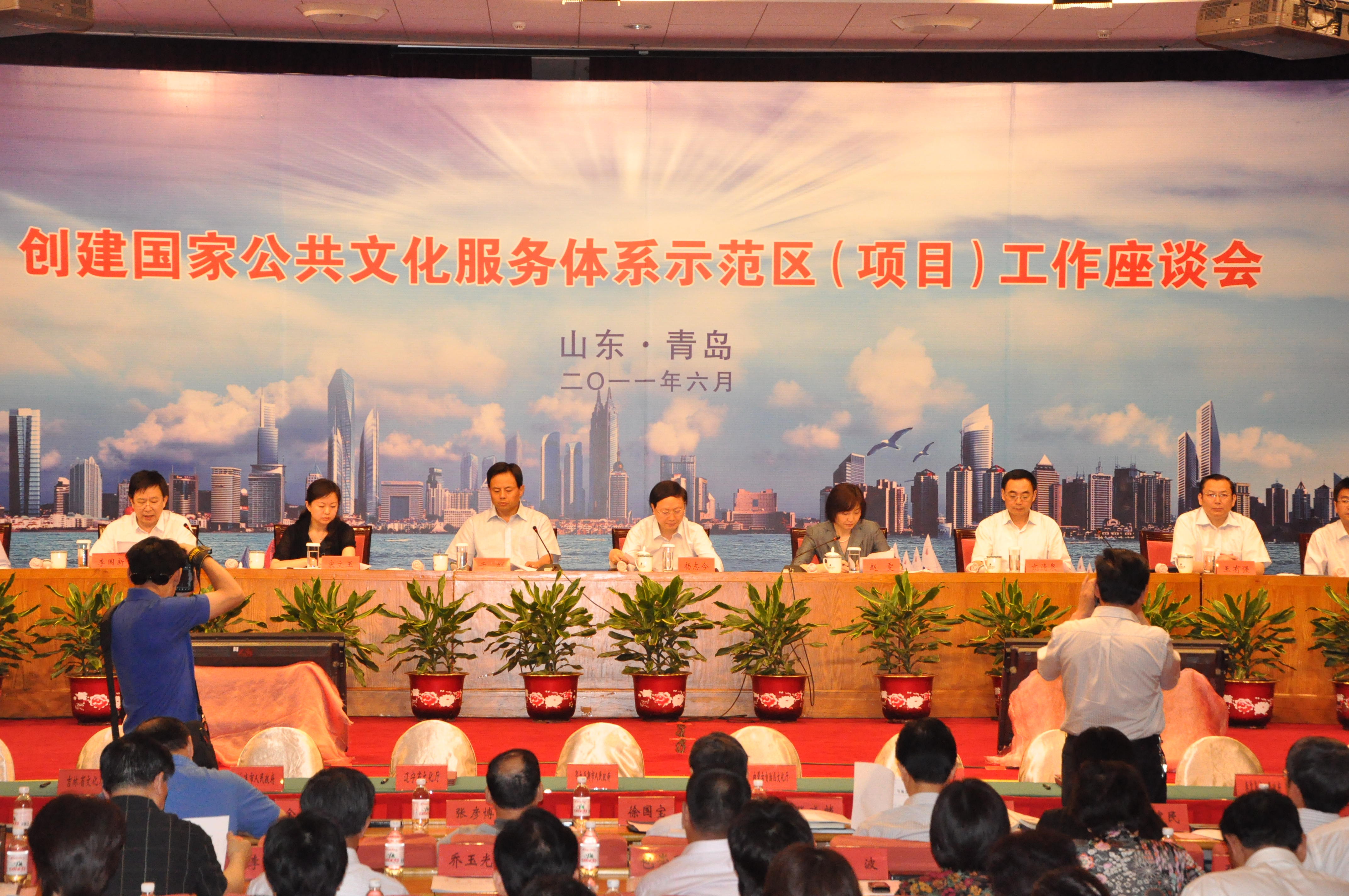 2011年6月1日,创建国家公共文化服务体系示范区工作座谈会议在山东省青岛市召开。会上,文化部、财政部公布了第一批创建国家公共文化服务体系示范区(项目)评审结果,创建示范区工作领导小组办公室与第一批28个创建示范区人民政府、省(市、区)文化厅(局)签定目标责任书,并就下一步创建工作做出具体部署。山东省青岛市副市长王修林、江苏省苏州市副市长王鸿生、河北省秦皇岛市副市长李秦生、广东省东莞市副市长严小康分别介绍了对开展创建示范区工作的认识和下一步工作的思路措施。国家公共文化服务体系建设专家委员会就如何完善示范区创建规划、开展制度设计等向与会代表进行了培训。会议还听取了各地文化厅局、创建示范区领导对下一步工作的建议。