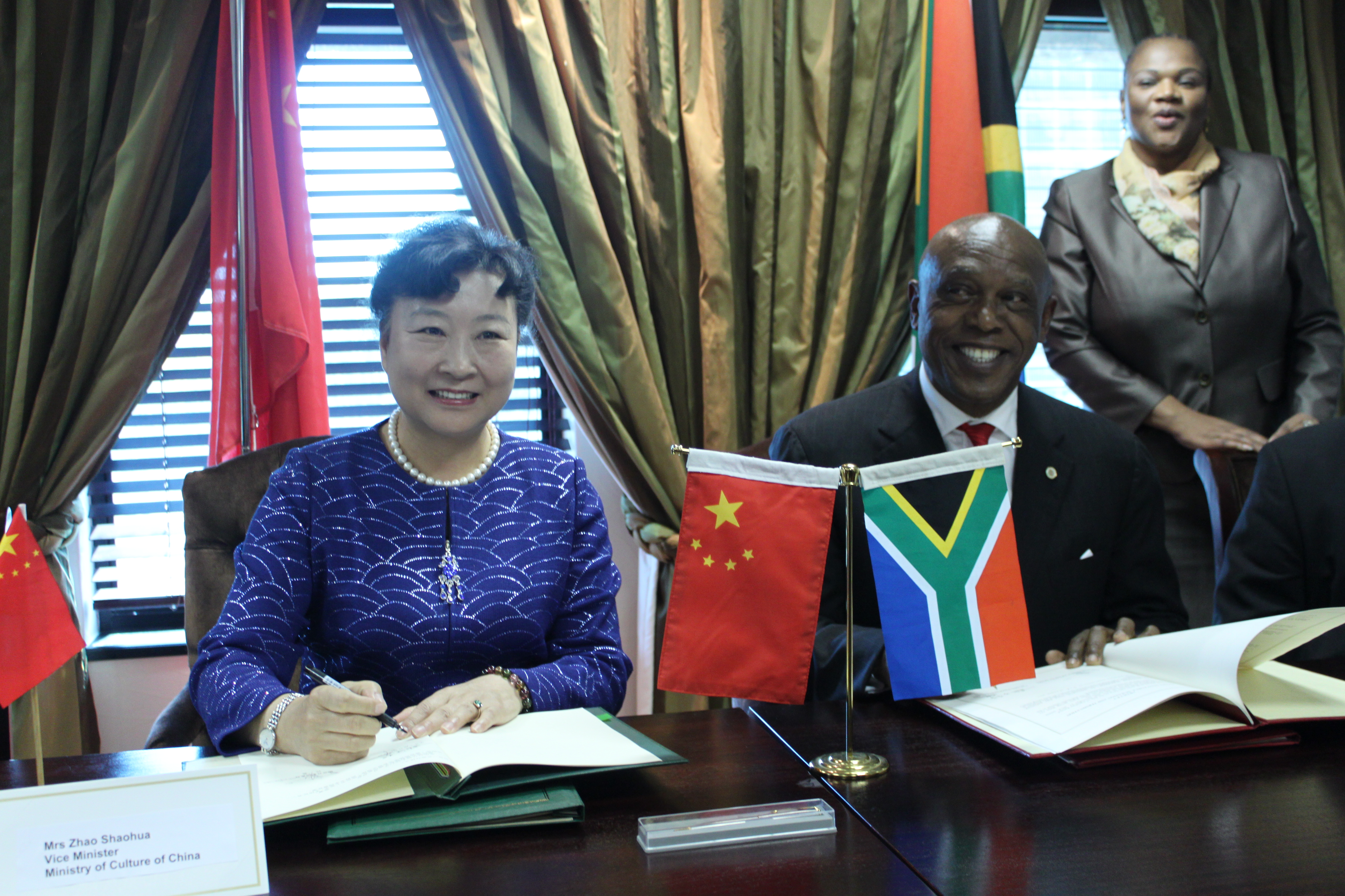 8月2日上午,赵少华副部长与南非艺术文化部代部长萨瓦里共同签署了《中华人民共和国政府和南非共和国政府文化艺术合作协定2011至2014年执行计划》。钟建华大使、尹亚利参赞、中国政府文化代表团全体成员,南非艺术文化部副部长法阿拉、总司长夏巴、代理副总司长乔克威尼以及南非多家主流媒体出席了签字仪式。