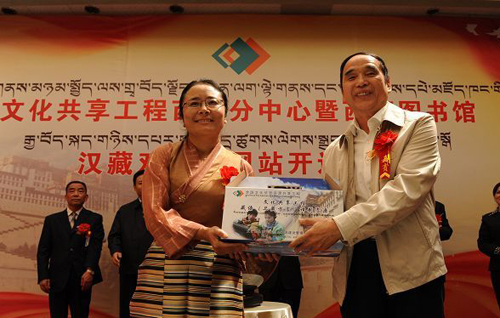 文化部全国文化信息资源建设管理中心主任张彦博(右)向西藏自治区分中心赠送藏汉双语资源