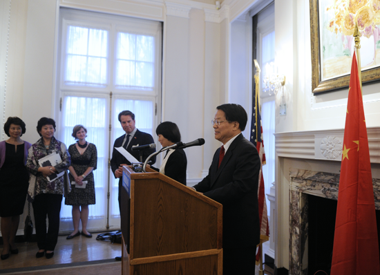 当地时间9月22日晚,《瓷都——景德镇当代中国瓷画展》开幕活动在美国华盛顿子午线国际中心举行。中国文化部部长蔡武、子午线国际中心总裁斯图尔特·霍利迪和华盛顿政界、商界和文化界名流逾300人出席了活动。
