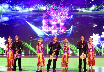 图一 印度尼西亚“和谐阳光”组合演唱中国人民耳熟能详的印尼民歌《星星索》,并以中文演唱《红梅赞》。