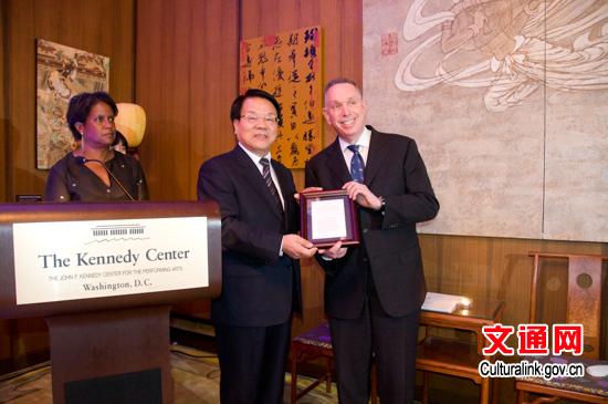 蔡武部长向肯尼迪表演艺术中心总裁凯瑟先生递交捐赠证书