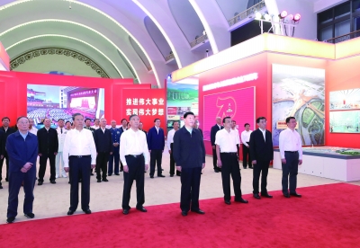 下午4时10分许,习近平等党和国家领导同志来到北京展览馆,步入展厅参观展览。展览以开辟和发展中国特色社会主义道路、建设社会主义现代化国家为主题,以编年体为时间主线,安排设计了5个部分,并体现历次党代会和重要中央全会、五年规划(计划)等方面的跨段主线,选择150个“新中国第一”进行展示,每10年设置英雄模范人物墙,充分运用声光电等多媒体科技展示手段,全方位立体化呈现新中国成立70年来中国共产党领导中国人民发愤图强、艰苦奋斗实现的伟大跨越,清晰展现党的领导和我国社会主义制度集中力量办大事的政治优势,深刻揭示新中国70年巨变背后的深刻道理。