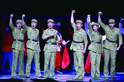 我们看到,在第一篇章“浴血奋斗”里,主创团队非常巧妙然而又是非常准确地找到了《国际歌》。当人们在巨大纵面的平台上看到鸦片战争背景下瘦骨嶙峋的吸毒者和衣衫褴褛的劳作者时隐时现,一种巨大的窒息感袭满全身。恰在此时,浑厚有力的念白之声在全场缓慢地响起:起来,起来!是谁在呼唤?是谁在呐喊?是中国共产党人!当《国际歌》的旋律响起,让人一下子联想到1922年入党、1923年开始担任中国共产党的机关刊物《新青年》主编的瞿秋白,字斟句酌、呕心沥血翻译《国际歌》的情形,更加令人赞赏的是,这样的艺术设计,暗喻了伟大历史复兴道路的当然逻辑起点,毫不犹豫,没有迟疑,充满了历史的必然力量!