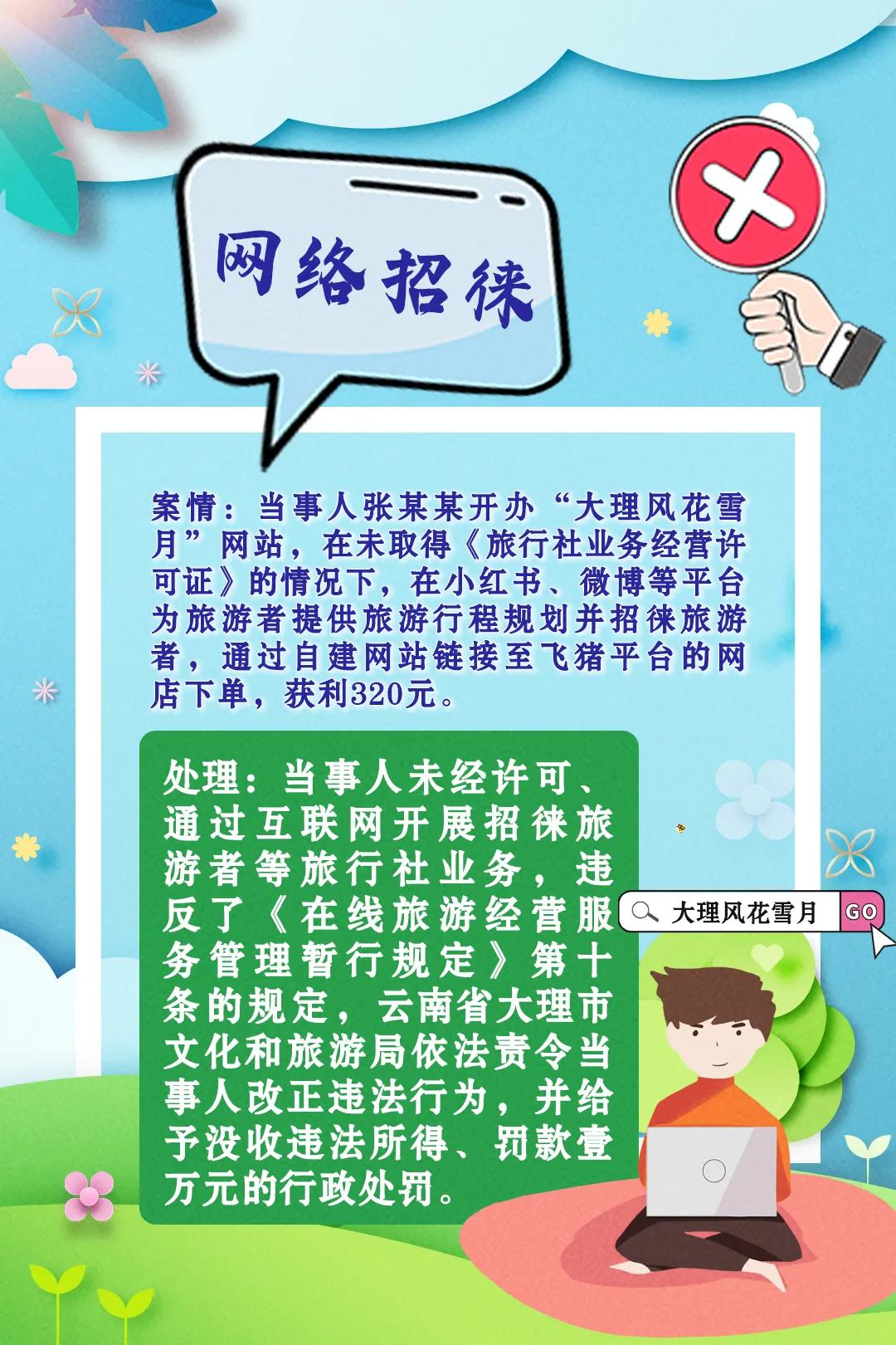 ——关键字:网络招徕。当事人张某某开办“大理风花雪月”网站,在未取得《旅行社业务经营许可证》的情况下,在小红书、微博等平台为旅游者提供旅游行程规划并招徕旅游者,通过自建网站链接至飞猪平台的网店下单,获利320元。当事人未经许可、通过互联网开展招徕旅游者等旅行社业务,违反了《在线旅游经营服务管理暂行规定》第十条的规定,云南省大理市文化和旅游局依法责令当事人改正违法行为,并给予没收违法所得、罚款壹万元的行政处罚。