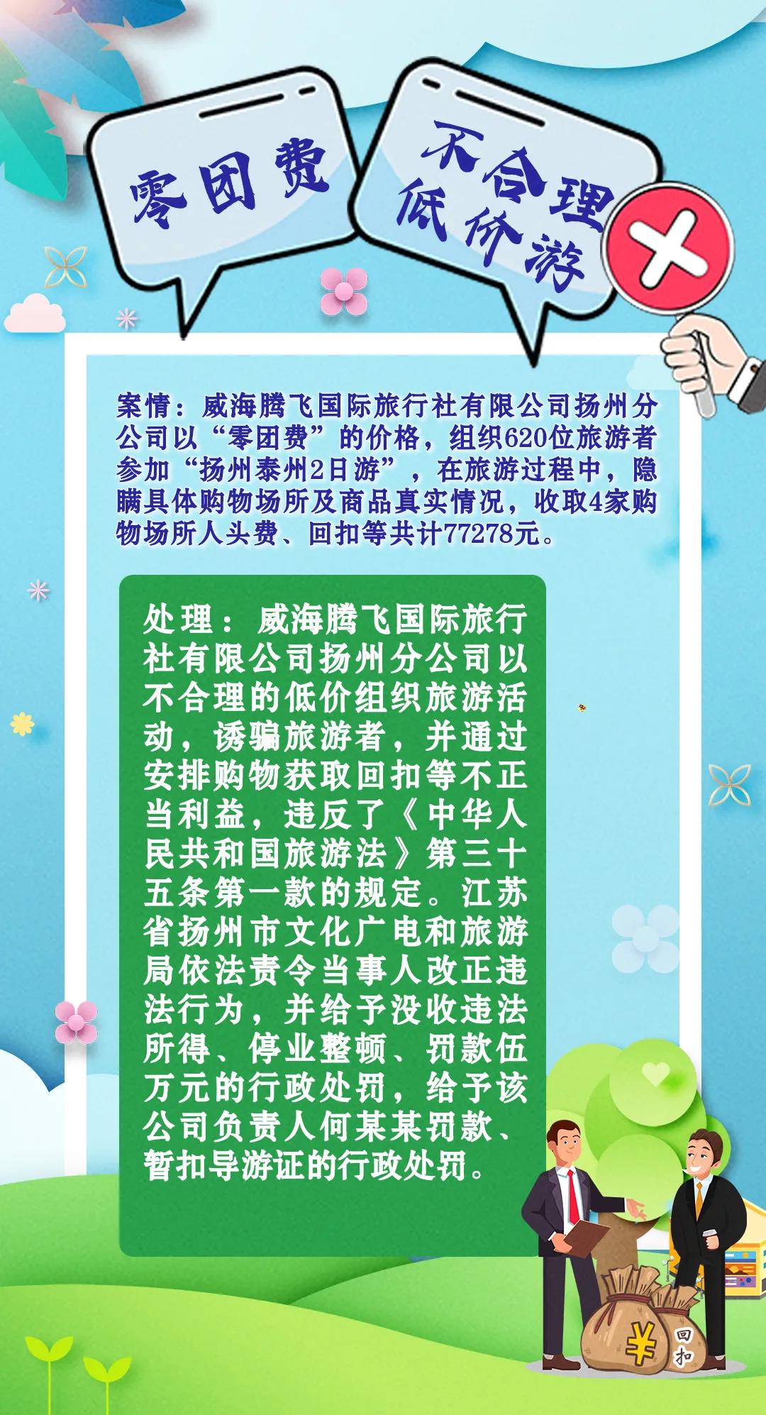 ——关键字:零团费、不合理低价游。威海腾飞国际旅行社有限公司扬州分公司以“零团费”的价格,组织620位旅游者参加“扬州泰州2日游”,在旅游过程中,隐瞒具体购物场所及商品真实情况,收取4家购物场所人头费、回扣等共计77278元。威海腾飞国际旅行社有限公司扬州分公司以不合理的低价组织旅游活动,诱骗旅游者,并通过安排购物获取回扣等不正当利益,违反了《中华人民共和国旅游法》第三十五条第一款的规定。江苏省扬州市文化广电和旅游局依法责令当事人改正违法行为,并给予没收违法所得、停业整顿、罚款伍万元的行政处罚,给予该公司负责人何某某罚款、暂扣导游证的行政处罚。