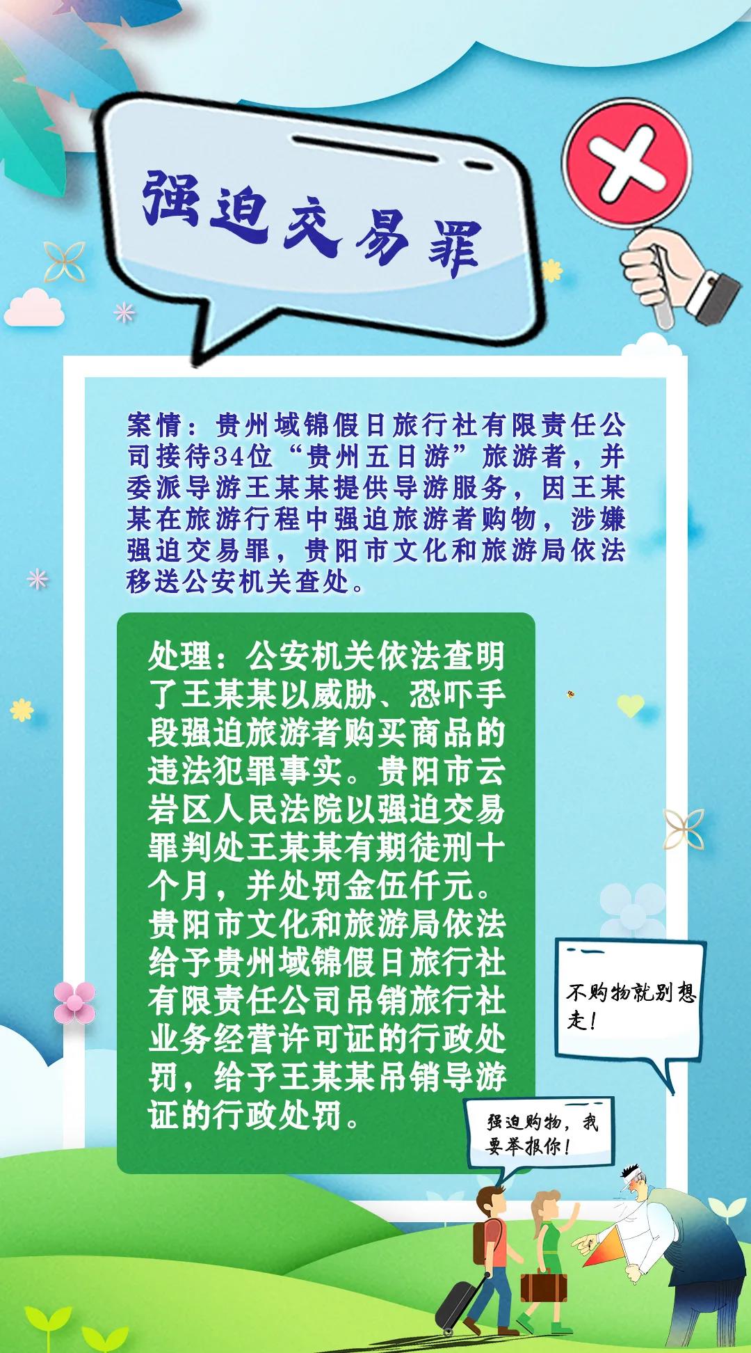 ——关键字:强迫交易罪。贵州域锦假日旅行社有限责任公司接待34位“贵州五日游”旅游者,并委派导游王某某提供导游服务,因王某某在旅游行程中强迫旅游者购物,涉嫌强迫交易罪,贵阳市文化和旅游局依法移送公安机关查处。公安机关依法查明了王某某以威胁、恐吓手段强迫旅游者购买商品的违法犯罪事实。贵阳市云岩区人民法院以强迫交易罪判处王某某有期徒刑十个月,并处罚金伍仟元。贵阳市文化和旅游局依法给予贵州域锦假日旅行社有限责任公司吊销旅行社业务经营许可证的行政处罚,给予王某某吊销导游证的行政处罚。