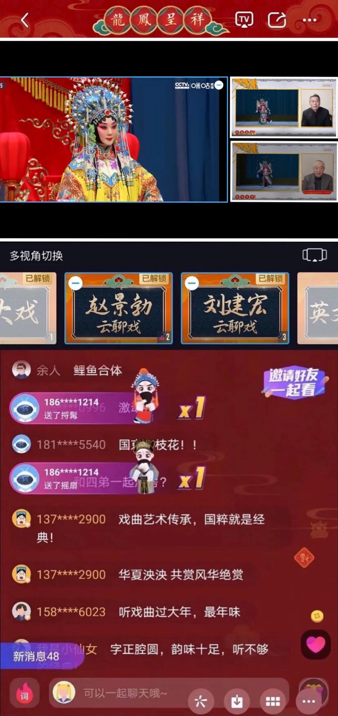 春节期间,国家京剧院、梅兰芳大剧院等官方平台和京剧演员纷纷下场互动宣传,刘建宏等大V、行业自媒体等也纷纷联动传播。与此同时,借助腾讯视频、哔哩哔哩、喜马拉雅、微博、微信、抖音、快手、视频号等互联网音视频平台的播出和联合推广,央视及多家媒体的重点报道,《龙凤呈祥》云演播引发了传播共振效应。