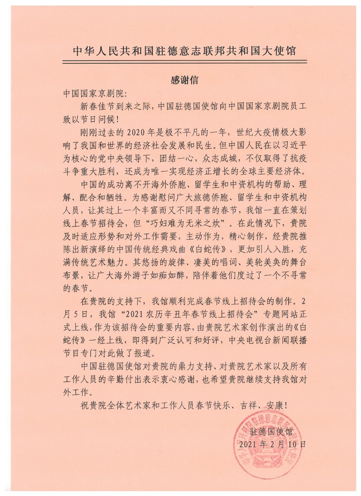 2月10日,中国驻德使馆专程向国家京剧致信感谢,对此次线上演出的成功表示祝贺并对演职员高超的艺术水准给予高度认可。