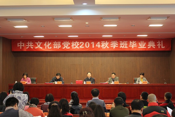 1月9日上午,中共文化部党校2014年秋季学期处级干部进修班毕业典礼在中央文化管理干部学院隆重举行。文化部党组副书记、副部长、中共文化部党校校委会主任、校长杨志今出席。文化部直属机关党委常务副书记刘长权,中央文化管理干部学院院长、中共文化部党校常务副校长张旭,本期进修班的老师以及60名学员出席典礼。毕业典礼由中央文化管理干部学院党委副书记、纪委书记、中共文化部党校副校长诸葛燕喃主持。