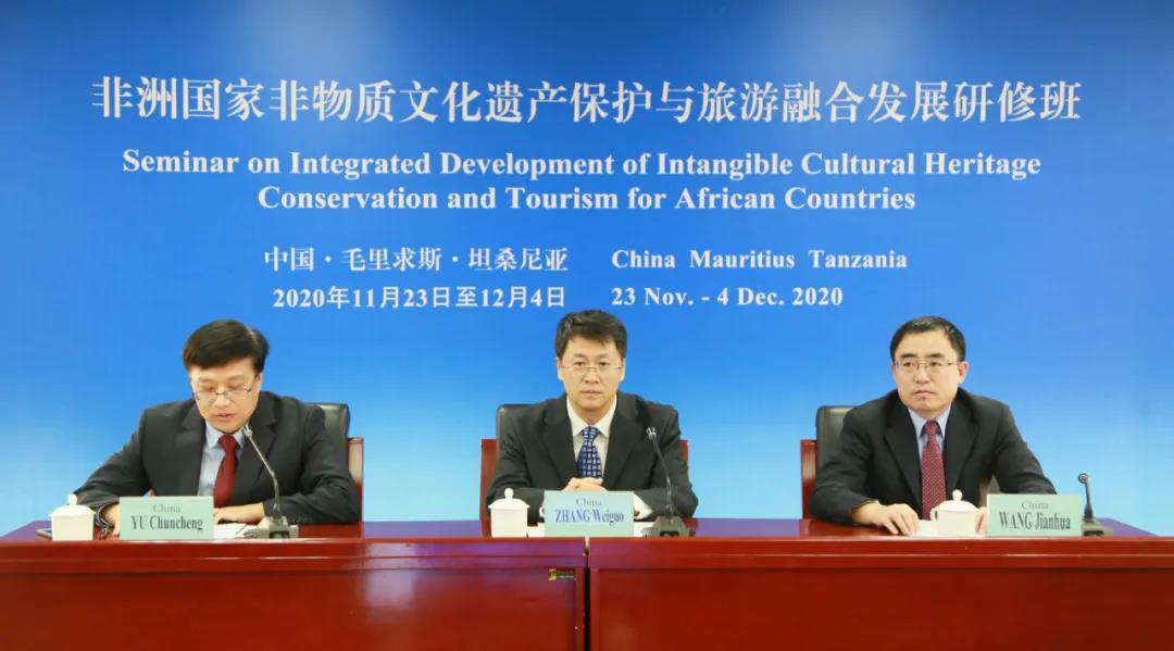11月23日,由文化和旅游部举办的线上“非洲国家非物质文化遗产保护和旅游融合发展研修班”在中央文化和旅游管理干部学院开班,毛里求斯、坦桑尼亚两国文化和旅游领域的政府官员、专家学者及从业人员共31人参加。文化和旅游部国际交流与合作局副局长张维国、坦桑尼亚联合共和国新闻文化艺术和体育部文化司司长埃曼努埃尔·卢卡斯·特穆、中央文化和旅游管理干部学院党委书记、副院长王建华出席并致辞。