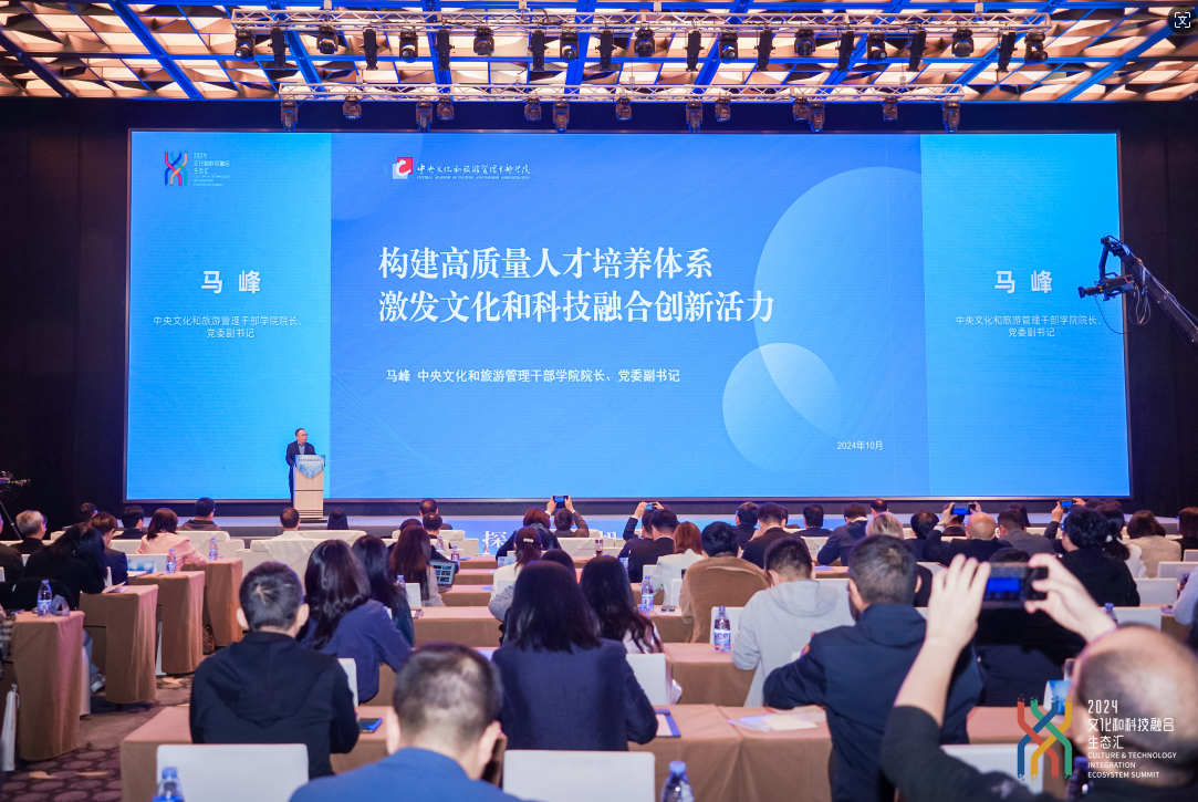 10月23日,由南京市文化投资控股集团主办,中央文化和旅游管理干部学院等单位作为支持单位的“2024文化和科技融合生态汇”在江苏省南京市举办。学院院长、党委副书记马峰出席并作“构建高质量人才培养体系 激发文化和科技融合创新活力”主题演讲。