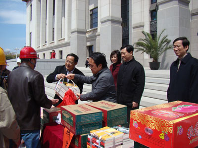在“五一”国际劳动节来临之际,2010年4月29日上午,文化部党组副书记、副部长欧阳坚在国家博物馆馆长吕章申等的陪同下,来到国博改扩建工程工地,亲切看望正在辛勤劳动的施工人员。