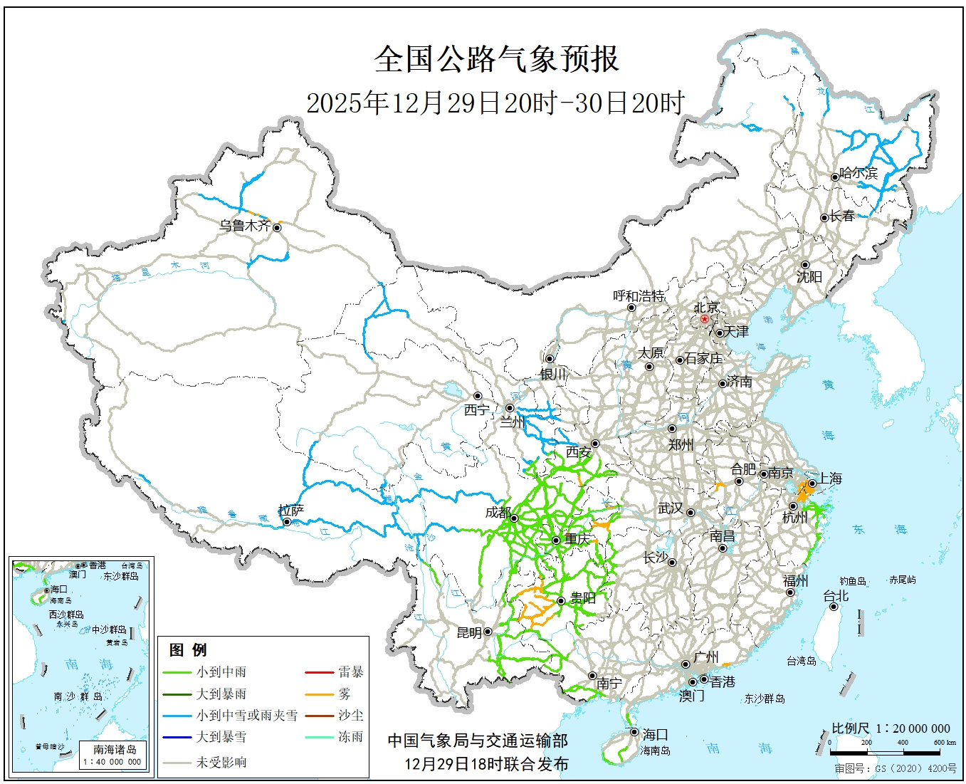 12月29日20时至30日20时,新疆沿天山地区和南疆山区、西藏东部、内蒙古东北部、黑龙江北部和东部、青海北部和南部、甘肃河西、宁夏南部、川西高原北部等地部分地区有小到中雪或雨夹雪。西北地区东南部、西南地区东部、广西西部、浙江东部、雷州半岛、海南岛等地部分地区有小到中雨。另外,上海西南部、浙江东北部、湖北西南部、贵州西部、新疆北部等地局地有雾。