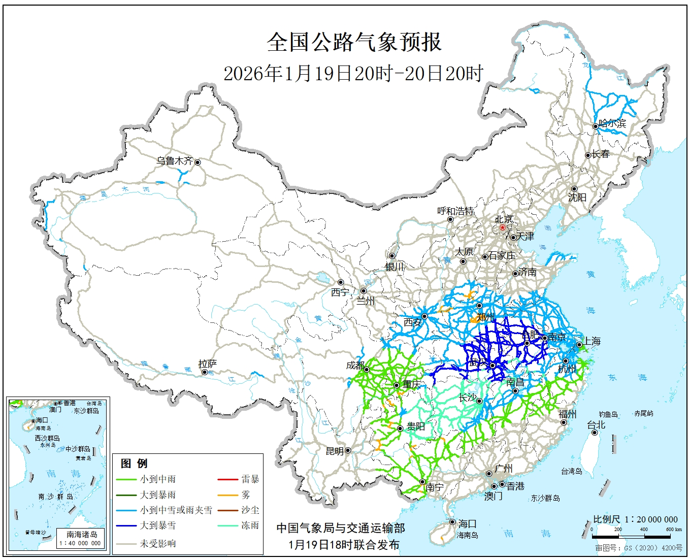 1月19日20时至20日20时,黄淮西部和南部、江淮、江汉、江南北部、西北地区东南部、山西南部、内蒙古东北部、黑龙江中部、新疆南疆西部山区、西藏东南部等地部分地区有小到中雪或雨夹雪,其中,河南南部、安徽中北部、湖北、湖南北部、江西西北部、重庆东部等地有大雪,其中,河南东南部、安徽西南部、湖北南部、湖南北部等地的部分地区有暴雪(10~15毫米);贵州东部、湖南西部和中北部、重庆东南部、湖北南部、安徽南部、江西北部等地的部分地区有冻雨或冰粒;江南中部和西南部、四川盆地、重庆中西部、贵州中部、广西西部和北部、云南东部等地部分地区有小到中雨。另外,山西南部、河南中部、湖南西部和中部、江西西部、四川东南部、重庆西南部、贵州中部和南部、广西北部和西南部、海南中部、陕西东部等地局地有雾。