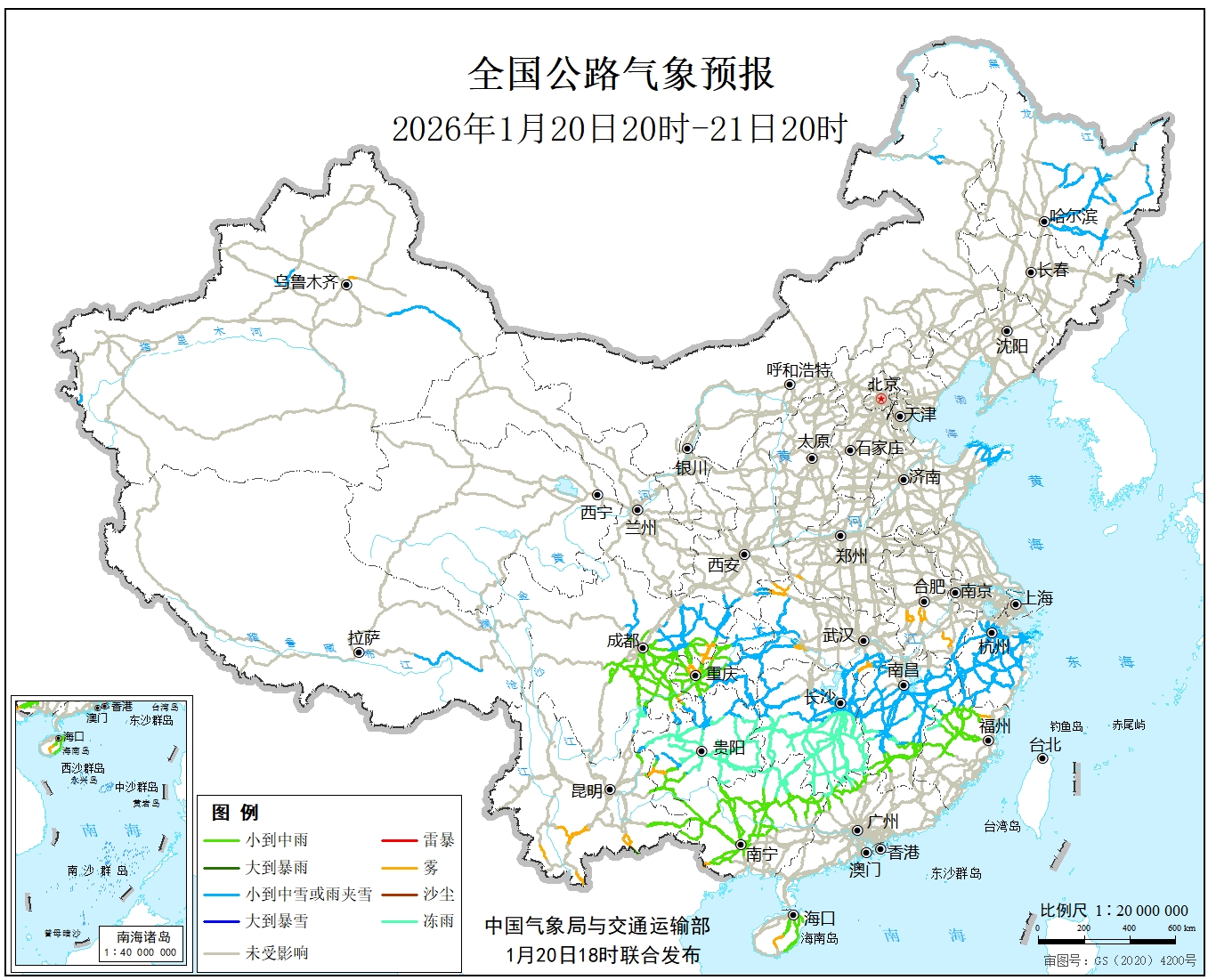 1月20日20时至21日20时,内蒙古东北部、黑龙江中东部、新疆沿天山地区、西藏东南部、湖北和西部、江南中北部、西南地区东部等地部分地区有小到中雪或雨夹雪。贵州、湖南中南部、广西北部等地部分地区有冻雨。西藏东南部、四川盆地、贵州西南部、江西中南部、福建中西部、广西西部和南部、台湾岛等地部分地区有小到中雨。另外,河南西南部、安徽中部和南部、湖北西北部和南部、湖南东部、江西西部、福建北部和中部、重庆西部、四川东南部、贵州西部和中部、云南南部、广西西南部、海南中部、新疆北部等地局地有雾。