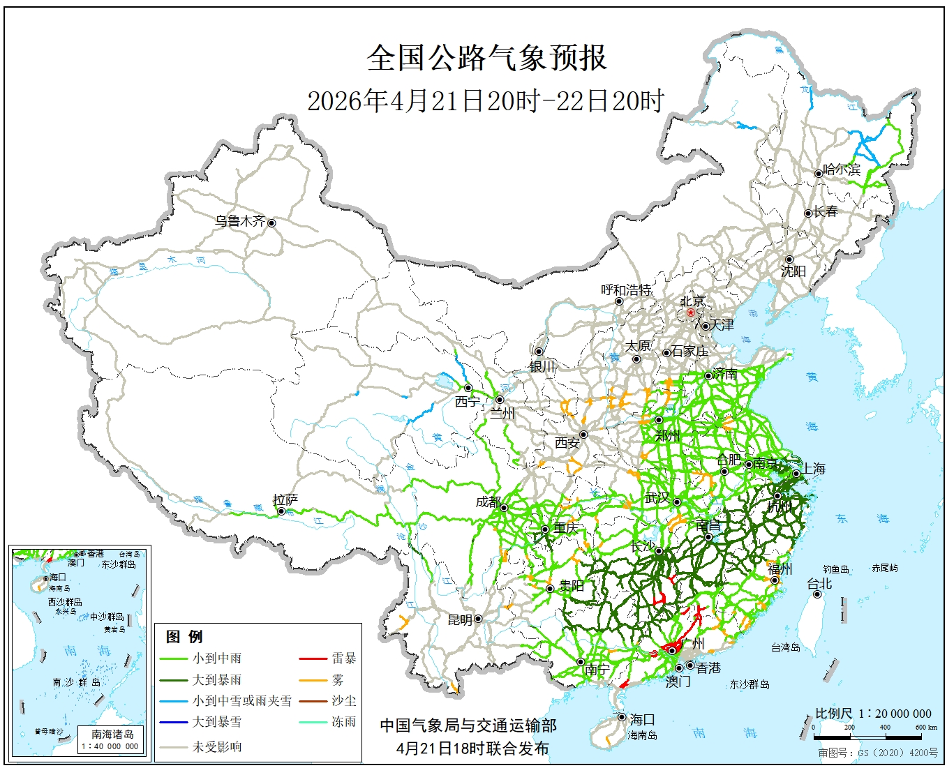 4月21日20时至22日20时,内蒙古东北部、黑龙江北部、青海中部等地部分地区有小雪或雨夹雪。西藏东南部、四川中部、重庆南部、云南西北部、贵州中东部、江南大部、华南北部、江淮南部等地部分地区有中到大雨,其中,湖南中部、江西北部、浙江西部、广西北部、广东西北部等地部分地区有暴雨,局地大暴雨。另外,河北南部、山西南部、陕西中部和南部、甘肃东北部、河南北部、江苏北部、安徽西南部、浙江东南部、福建东部、湖北中部和东南部、湖南西北部、四川盆地东部、重庆中部、贵州中部、广东东部、广西东部、云南西部和南部、海南南部等地局地有雾。