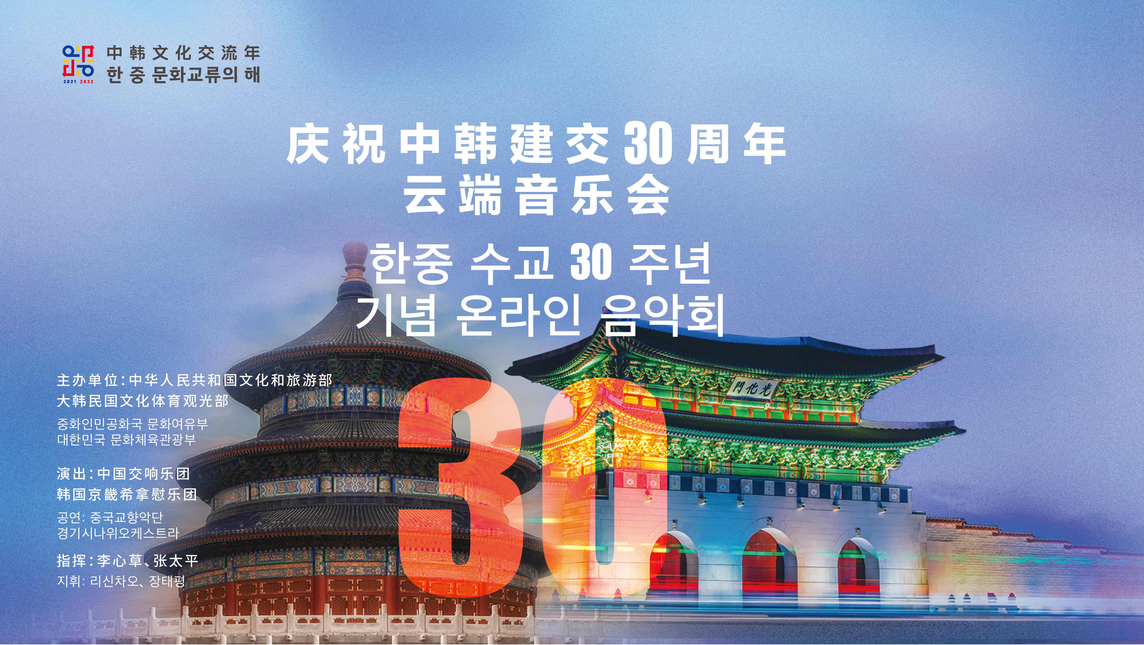 8月24日,由中国文化和旅游部、韩国文化体育观光部共同主办的庆祝中韩建交30周年云端音乐会在线上播出。中国文化和旅游部部长胡和平、韩国文化体育观光部长官朴普均发表视频致辞。