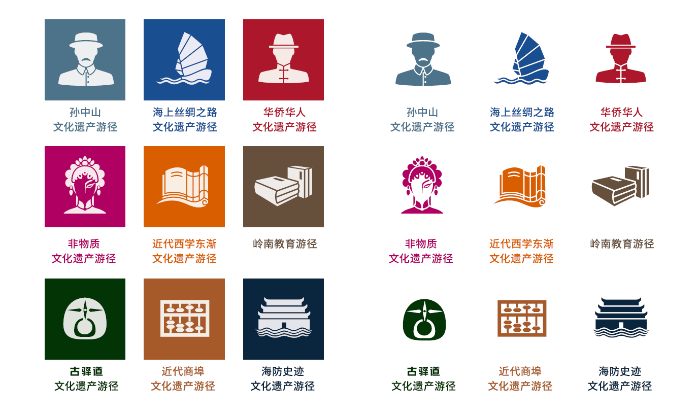 文化遗产游径具有线性主题鲜明但遗产资源点状分布分散的特点,构建美观大方、标准统一、指引清晰的游径标识系统有助于打破文化遗产的空间物理隔离,强化游径的线性体验。粤港澳大湾区因海而生,与海共荣,文化遗产游主标志以广州历史悠久的市舶制为设计的概念来源,背后的三个方格框,寓意粤港澳三地,表现形式是模仿古本的方格,象征文化历史。前面的三条弯线同样寓意三地,象征海浪、路径,通过三线的流动,联系起了三地,贯穿了地理历史文化。