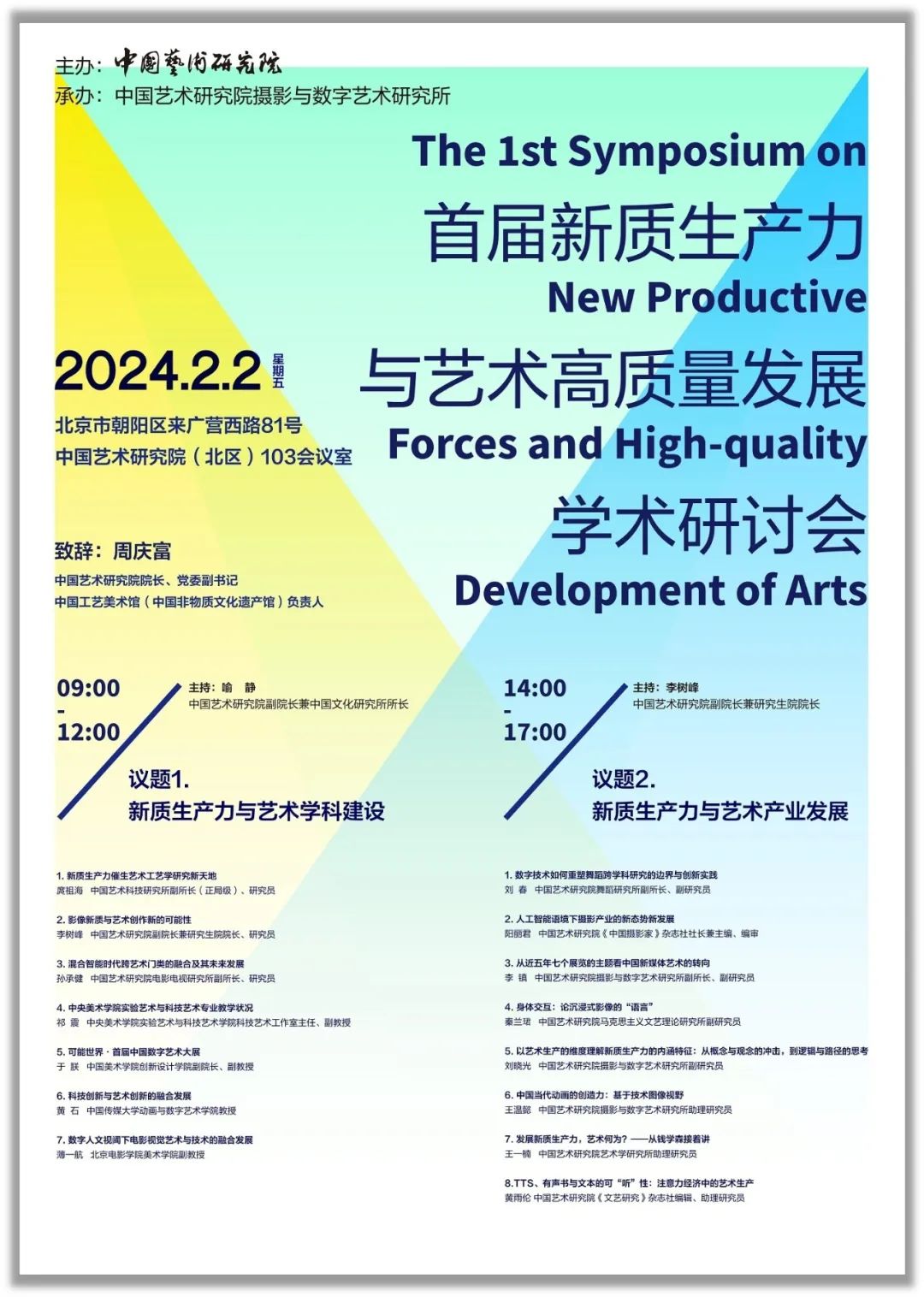 2024年2月2日,“首届新质生产力与艺术高质量发展学术研讨会”在中国艺术研究院成功举办。此次研讨会由中国艺术研究院主办、中国艺术研究院摄影与数字艺术研究所承办,中国艺术研究院院长、党委副书记周庆富出席会议并致辞,中国艺术研究院副院长兼研究生院院长李树峰、中国艺术研究院副院长喻静分别主持了两个议题的研讨。