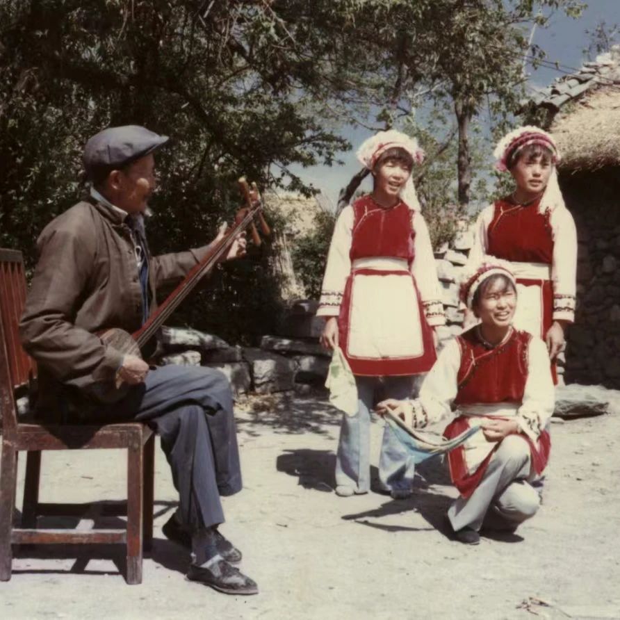 伍国栋在云南大理上鸡邑进行白族音乐采访时,白族老歌手教青年唱大本曲 1985年