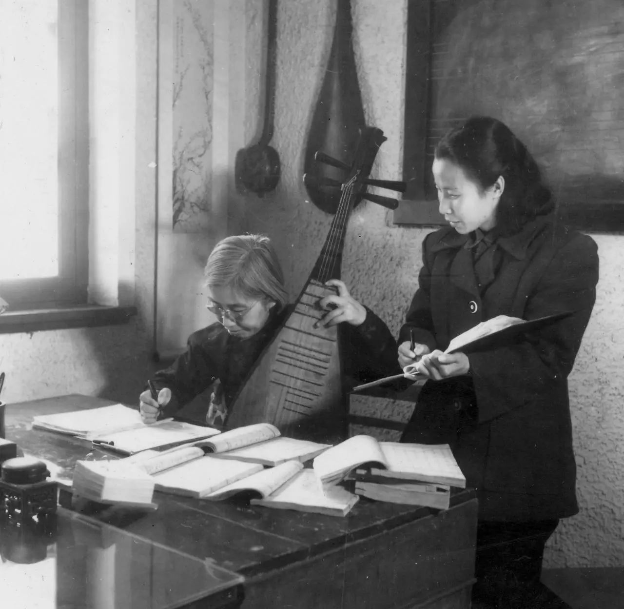 曹安和(左)与文彦将初步译成的《弦索十三套》线谱与简谱进行对照核校 1955年