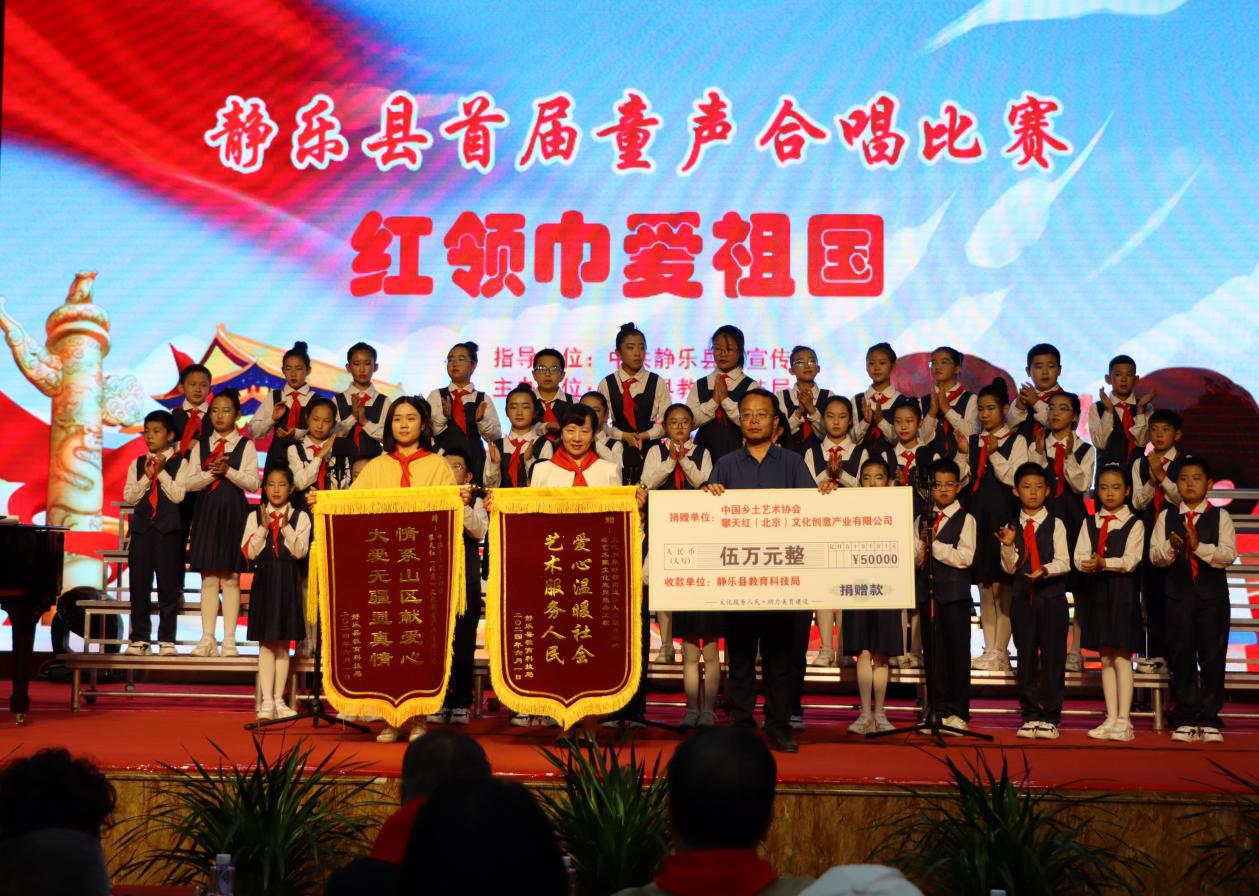 合唱比赛结束后,多年深耕静乐美育事业、在静乐开展艺术扶贫的中国交响乐团一级演员李克,携手中国乡土艺术协会、攀天红(北京)文化创意产业有限公司共同向静乐县科教局捐款16万元,用于静乐县学校的教学设施改善、合唱团发展以及留守儿童的基本生活保障。捐赠仪式最后,现场观众、参赛队伍和老艺术家们高声合唱《我和我的祖国》,艺术拉近距离,文化助力美育的内涵在此刻得以具象化,现场观众泪光闪动、心潮澎湃。